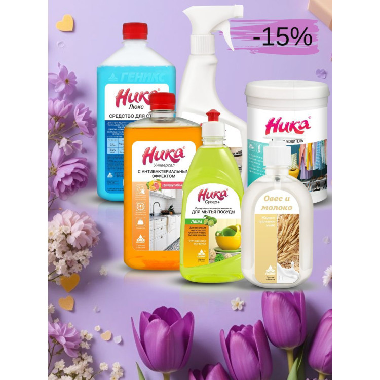 | Средство от жира "Жироудалитель", - Состав: Поверхностно-активные вещества < 5 %. Гидроксид натрия 5-15 %. Комплексообразователь < 5 %. Стабилизирующие и вспомогательные компоненты. Вода. Средство для мытья пола и поверхностей "Ника Универсал антибактериальный" - Состав: НПАВ менее 5%. Дезинфицирующий компонент. Средство для мытья посуды "Ника Супер плюс" - Состав: АПАВ >5%. НПАВ <5%. Ароматизирующяя добавка. Загуститель. Пищевой краситель. Средство для стирки "Ника Люкс" - Состав: НПАВ ≈30%. Фосфаты <5%. Комплексообразователь. Оптический отбеливатель. Ароматизирующая добавка. Краситель. Вода. Средство от пятен "Ника Пятновыводитель" - Состав: Кислородный отбеливатель примерно 30%. ПАВ. Натрия триполифосфат. Активатор. Оптический отбеливатель. Энзим. Мыло жидкое "Овес и молоко" - Состав: АПАВ. НПАВ. | |